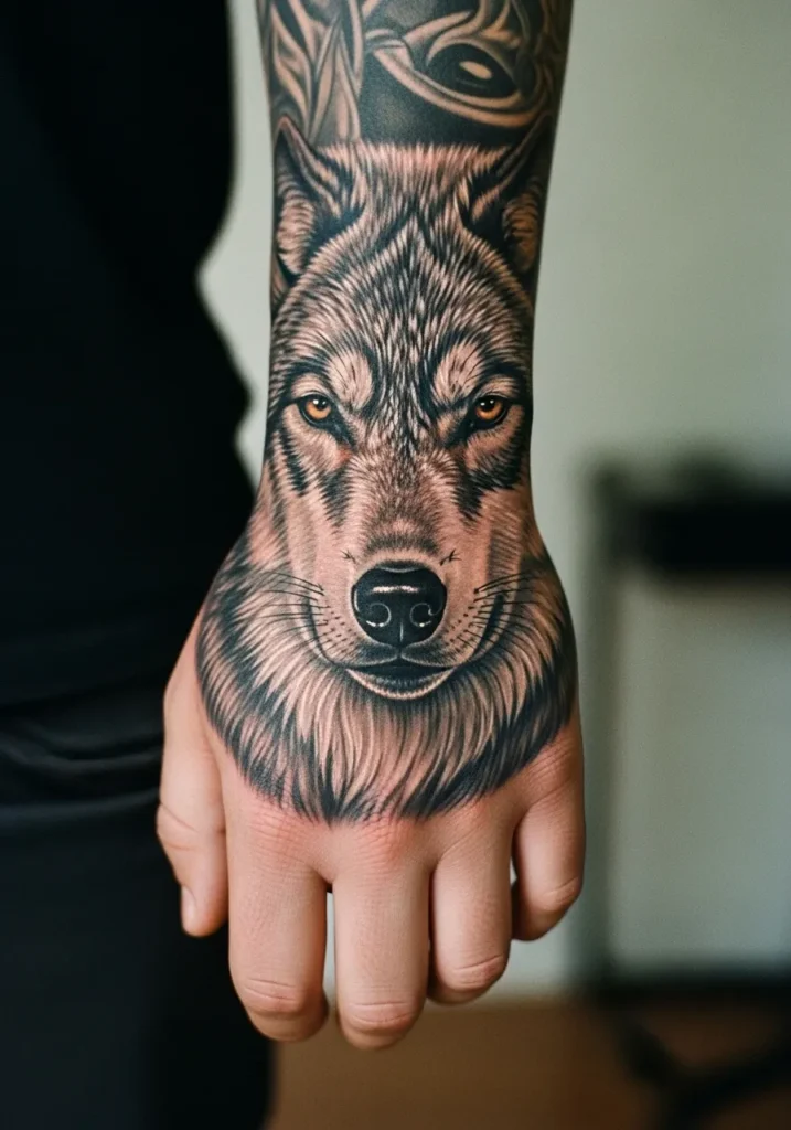 I find this tattoo incredibly powerful. The wolf represents loyalty, strength, and independence, and having it inked on the hand feels like wearing those traits with pride. It s bold without trying too hard, and that s what makes it so captivating.