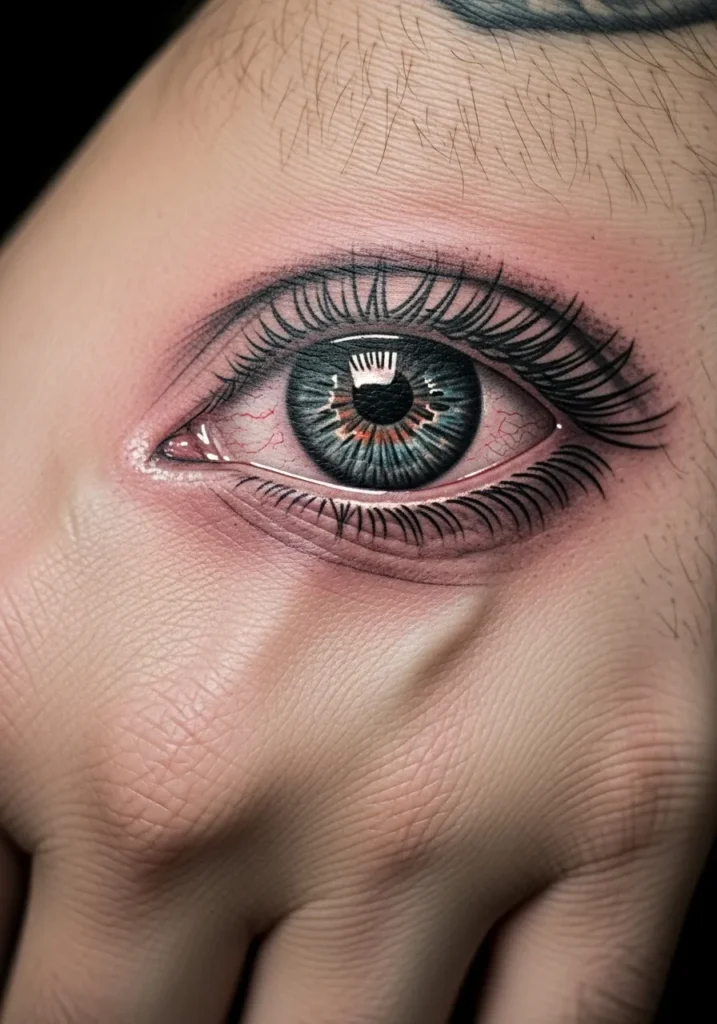 This eye tattoo almost feels alive with its hyper-realistic detail. The fine lines, glossy highlights, and veins in the sclera make it look incredibly lifelike. Set across the top of the hand, it s an intricate blend of light pink, grey, and blue tones that create depth and emotion.