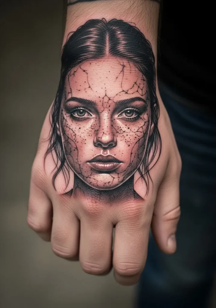 This hyper-realistic tattoo portrays a woman s face across the top of the hand, featuring intricate cracked porcelain effects that give it an artistic, surreal edge. The shading, expression, and skin texture details are unbelievably lifelike, blending art and realism effortlessly.