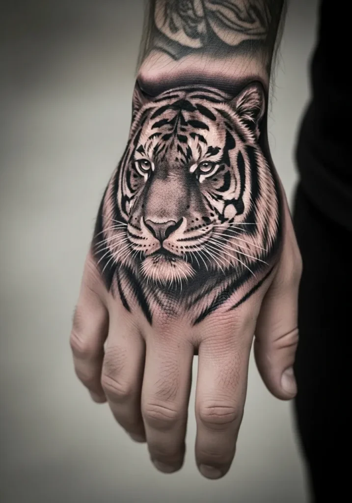 This striking realism tattoo showcases a tiger s face spread across the hand, with piercing eyes and beautifully shaded fur. The black and grey tones are perfectly balanced, giving the piece strength and intensity. The placement aligns seamlessly with the knuckles, adding a natural flow to the tiger s expression.