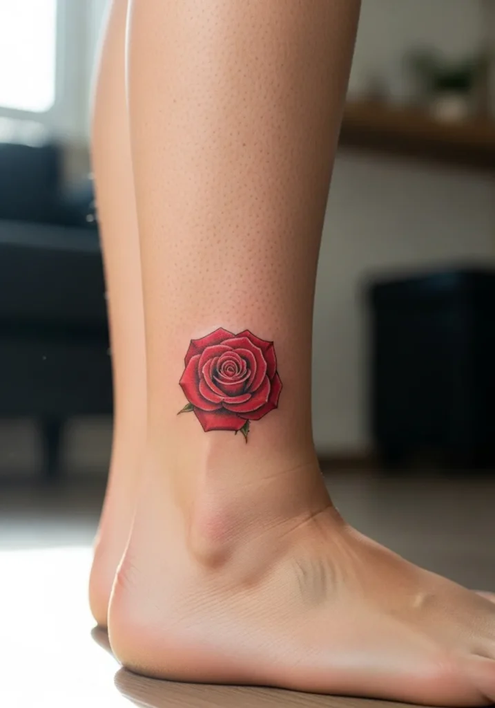 This small red rose tattoo sits just above the ankle, and it s so realistic you can almost smell it. The petals have soft shading and a subtle shine that makes the bloom pop against the skin. Its placement feels both classic and quietly bold a timeless piece that never goes out of style.
