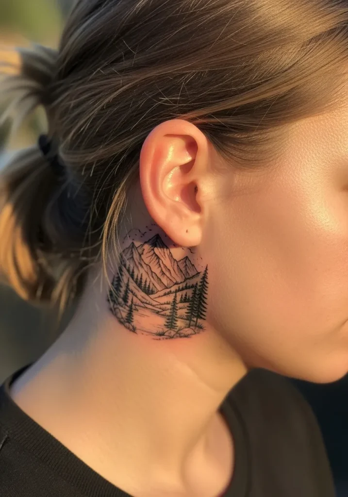 This minimalist mountain scene behind the ear is full of delicate black and gray linework. Tiny trees, peaks, and subtle shadows make it feel like a peaceful escape tucked right under the hairline. The placement is unexpected and gives the design a sense of mystery.