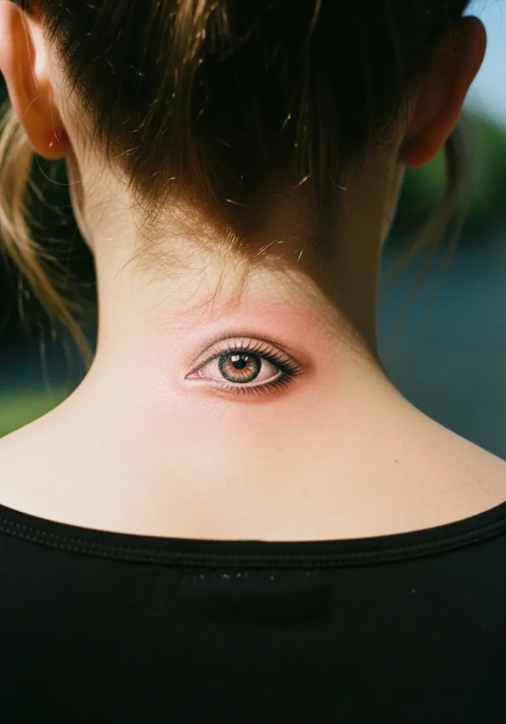 This tattoo of a realistic eye sits at the center of the neck, just below the hairline. The artist captured every tiny lash, the glossy light reflection, and even the warm tone of the iris. It s mesmerizing in its precision and feels almost surreal in how real it looks.