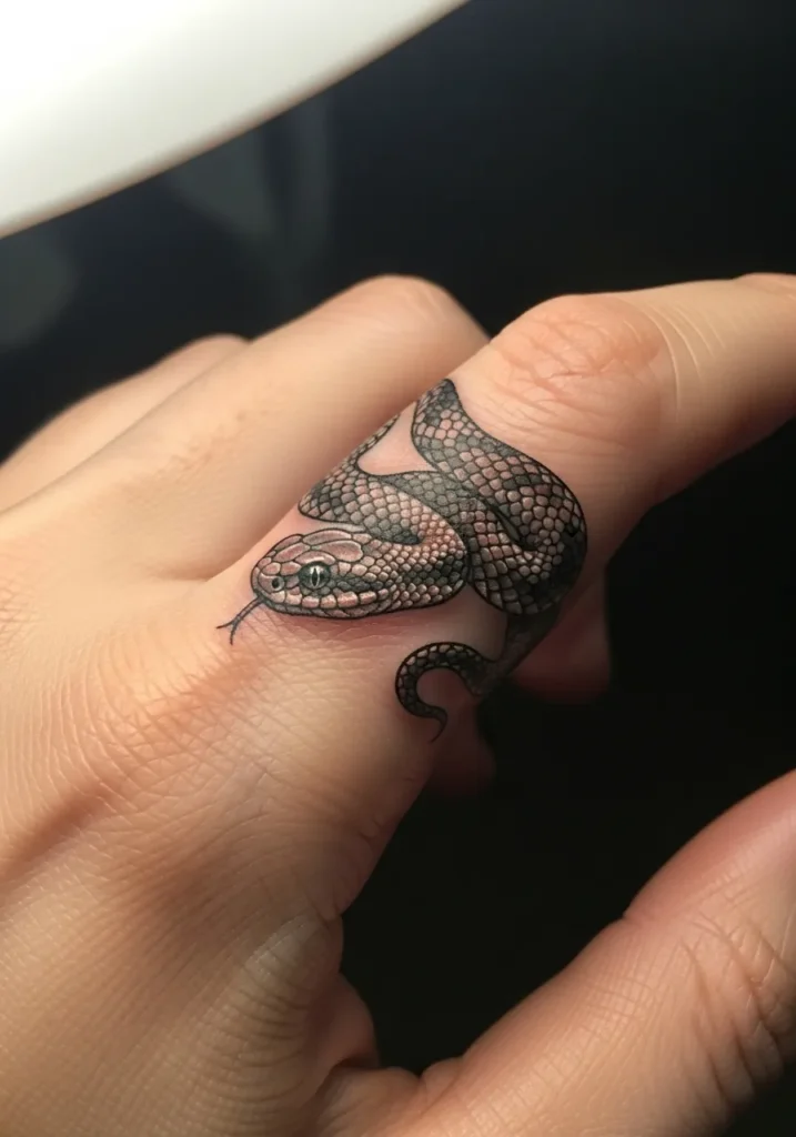 This small snake tattoo curls around the finger in a lifelike wrap, its scales shaded perfectly to give a three-dimensional texture. The soft blend of grays and the tiny forked tongue make it look almost real, but not in a scary way more sleek and stylish. The placement is bold yet surprisingly delicate.