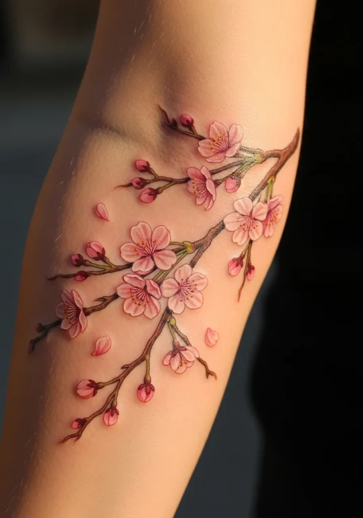 This cherry blossom tattoo stretches softly across the arm, with delicate pink petals and fine brown branches that look almost painted on. The blossoms are shaded so beautifully that they seem to glow under the skin. It s detailed but still small enough to feel feminine and light.