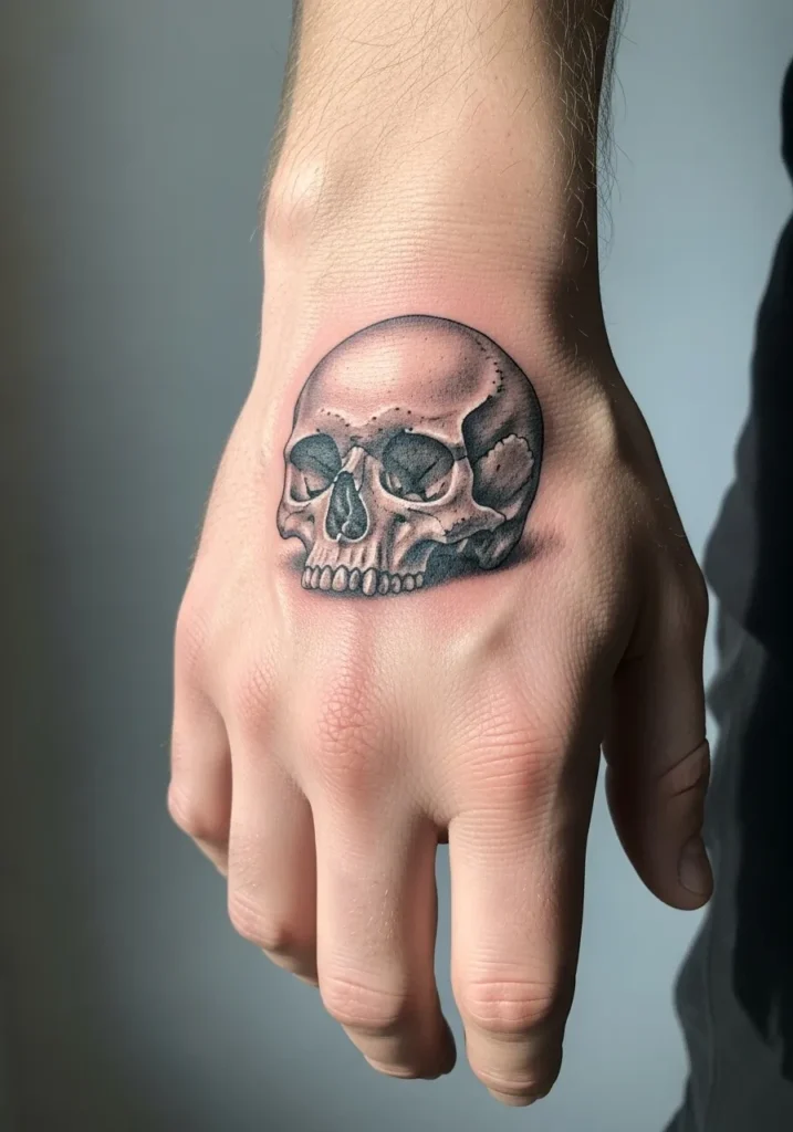 This small skull tattoo rests on the hand, perfectly shaded with smooth grayscale tones that make the bone structure pop. The proportions and depth give it a true-to-life look, while the compact size makes it a bold yet tasteful statement.