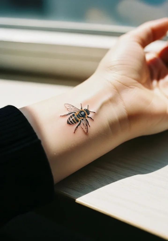 This tiny bee tattoo sits perfectly on the wrist, its wings so transparent and detailed that it looks ready to take off. The golden stripes and soft shading give it an incredibly realistic touch, while its size keeps it subtle and elegant.