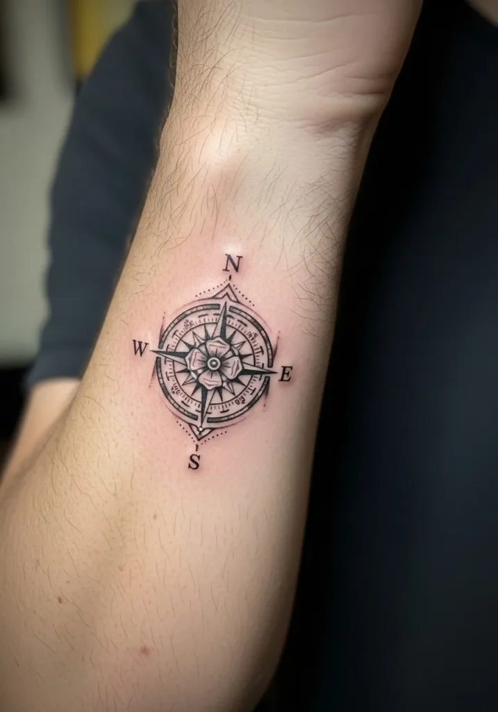 This detailed compass tattoo sits neatly on the inner wrist, its fine lines and soft shading creating a perfect miniature piece of art. The realistic depth in the design makes the compass rose stand out beautifully while keeping it clean and simple.