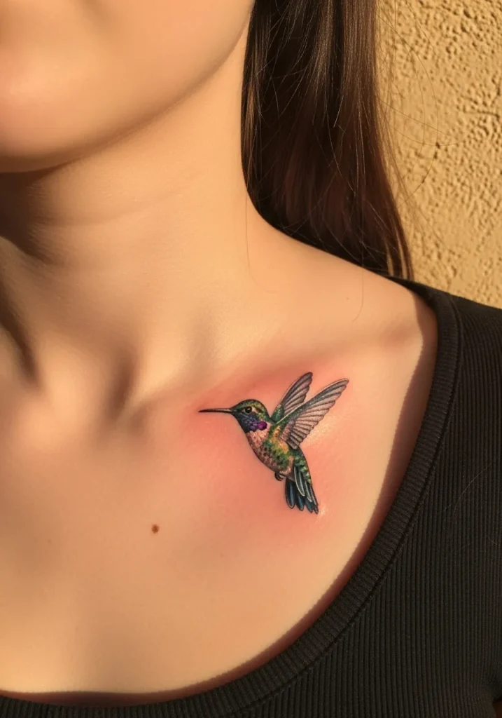 This tiny hummingbird tattoo looks incredibly lifelike, placed just above the collarbone where it catches the light beautifully. The detail in the feathers and the mix of green, violet, and gold tones give it a shimmering effect that almost looks like it s fluttering mid-air. It s small, delicate, and perfectly balanced with the natural curve of the shoulder.