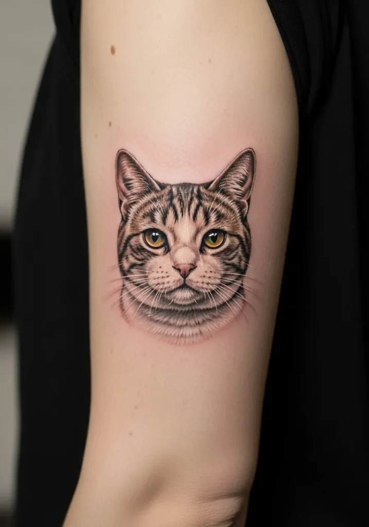 This tiny realism tattoo captures the sweetest cat face with stunning precision. Every whisker, stripe, and gleam in the eyes feels true to life. The artist nailed the soft fur texture, and the shading makes it look like the cat is about to blink.