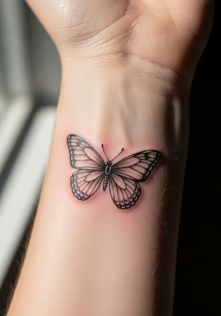 This small butterfly tattoo spreads its wings across the wrist, outlined in fine black lines with light shading that gives it a soft, natural look. The symmetry and detail make it feel lifelike without being heavy.