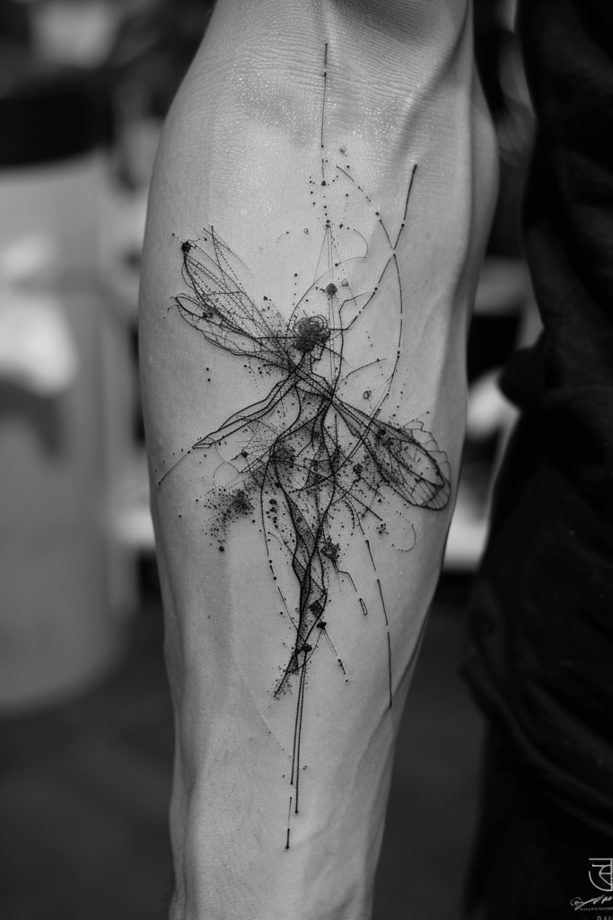 This tattoo features an abstract design of a fairy, depicted with sweeping lines and splatters of ink on the forearm. The fairy s form is suggested rather than fully outlined, with wings that blur into the surrounding splashes. This style creates a sense of motion, as if the fairy is swiftly moving or perhaps disintegrating into thin air.