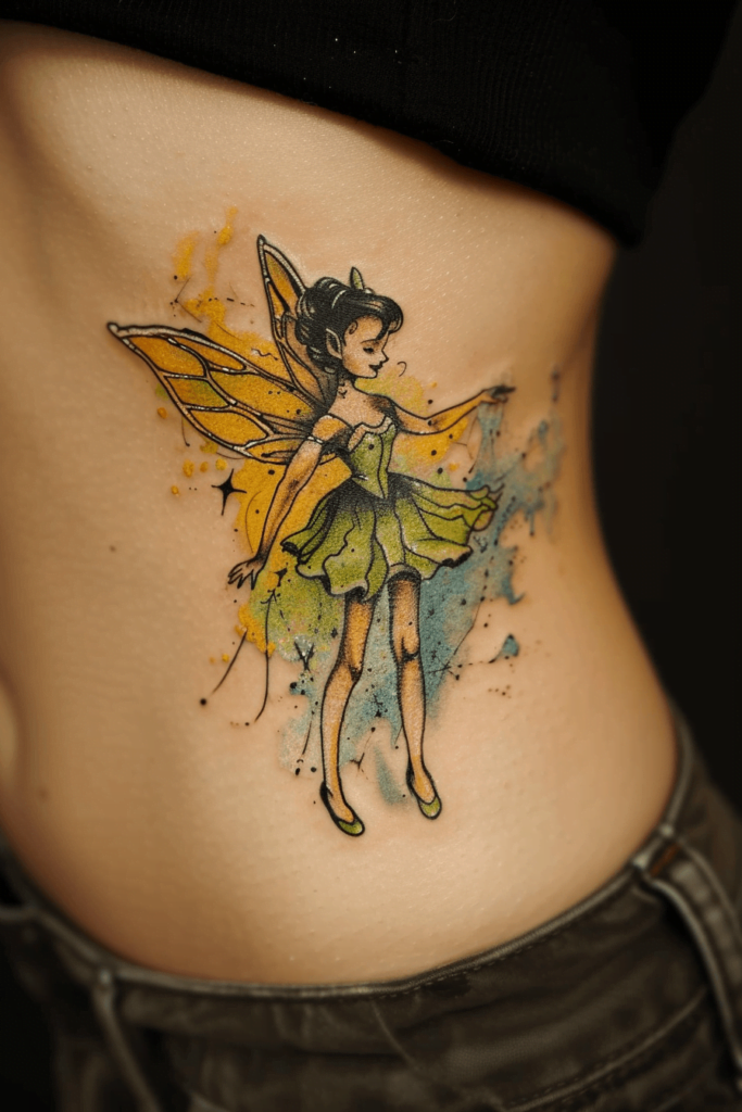 This side rib tattoo features a fairy rendered in a vibrant watercolor style. She stands poised with a whimsical expression, her wings spread wide. The colors are a blend of soft yet bold yellows, greens, and blues, appearing as if splashed beyond the outlines to create a dynamic effect. It gives the impression that the fairy might flutter away at any moment.
