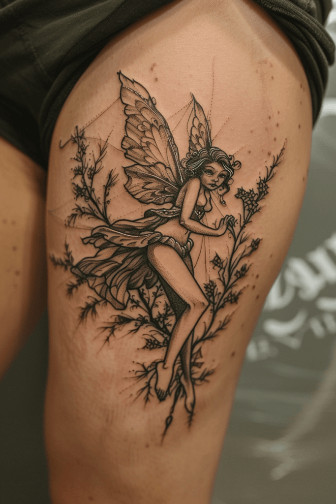 I find this tattoo impressive for several reasons. The level of detail in the fairy s wings and the surrounding flora demonstrates remarkable skill. Its placement on the thigh is ideal for such an expansive and intricate piece, providing ample space to appreciate the artwork s complexity. This tattoo is a perfect blend of nature and fantasy, appealing to those who cherish both beauty and storytelling in their ink. It s a stunning visual narrative, captured in permanent form.