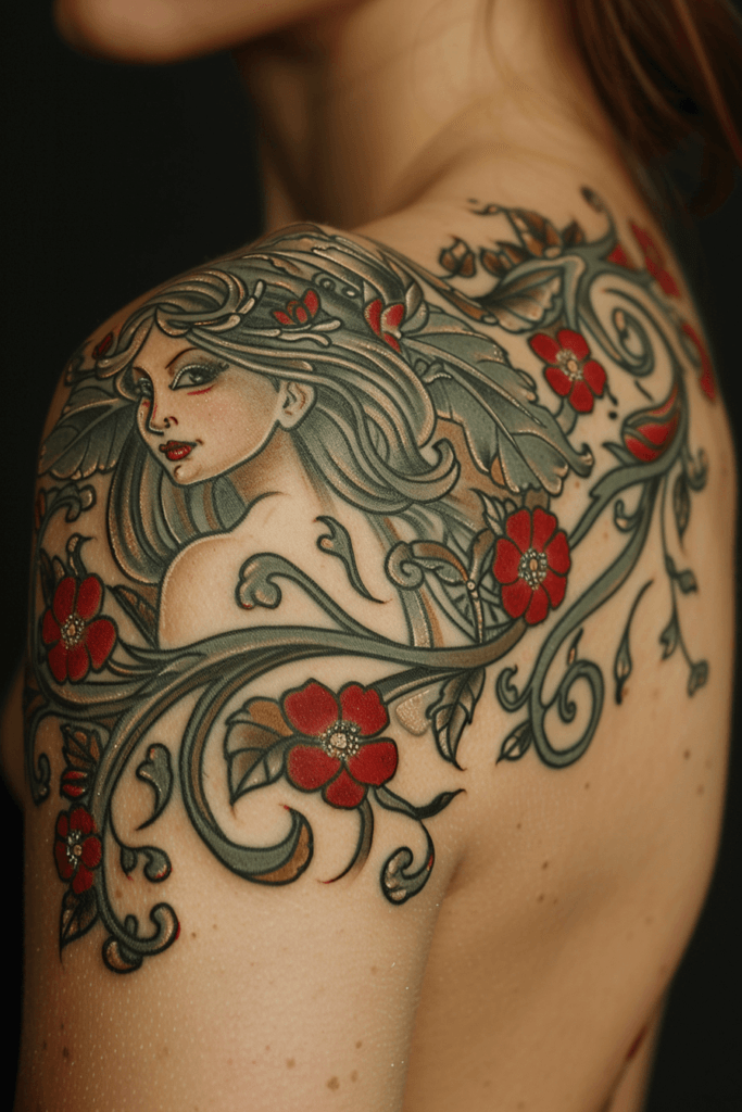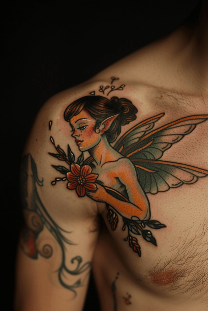 This shoulder tattoo features a fairy entwined with flourishing floral designs. The fairy s expression is serene, her gaze distant and thoughtful. Bold red flowers contrast sharply with the subtle shades of grey that define her flowing hair and graceful wings. Intricate line work and shading add depth, making each petal and leaf stand out. The artwork extends over the shoulder, creating a natural flow that enhances the body s contours.