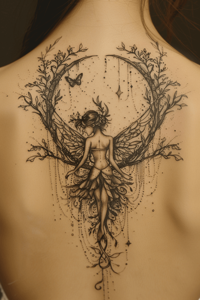 I m obsessed with how effortlessly this design combines simplicity with a hint of mystery. The crescent moon gives off those night-sky vibes, and the fairy looks like she s about to sprinkle some stardust. It s a classy tattoo that doesn t try too hard but still grabs attention. Honestly, it s perfect for anyone who loves a mix of whimsy and elegance because who wouldn t want a little moonlit magic on their back?