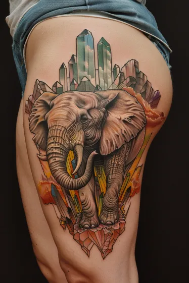 This bold Salvador Dali tattoo places a majestic elephant front and center, standing proudly atop a bed of sharp, surreal crystal formations. Behind the elephant, glowing gem-like towers rise into the sky, blending fantasy and realism with every color-packed detail. The contrast between the soft texture of the elephant s wrinkled skin and the sharp, angular crystals is striking and gives off that dreamlike, impossible energy Dalà was known for. Everything is wrapped in warm tones with pops of cool greens and purples that bring this wild scene to life.