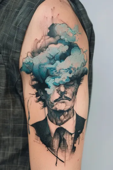This surreal Salvador Dali tattoo shows a sharply dressed man whose head seems to dissolve into a stormy explosion of soft blue clouds. His facial features are drawn in a sketchy, almost ghostlike way, giving the whole piece a dreamlike and mysterious feel. The contrast between the structured suit and the chaotic sky bursting from his mind is so clever. It plays with the idea of thought, identity, and imagination all at once, and the watercolor-style blending makes the clouds look like they re actually moving.