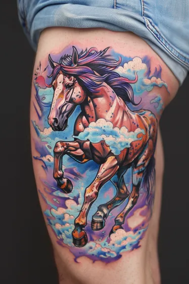 This vibrant Salvador Dali tattoo shows a powerful horse galloping through a dreamscape of fluffy clouds and surreal skies. The horse itself is painted in soft, peachy pinks with bold purple shadows and a windswept mane that practically floats. Metallic hooves shimmer like they re made of chrome, while the swirling clouds wrap around its body like it s half emerging from another dimension. The background bursts with playful purples and blues that make everything feel a little unreal in the best way.