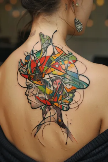 This striking Salvador Dali tattoo features two faces in profile, intertwined through a wild mosaic of vivid color and geometric chaos. The bold lines and stained-glass-style shading create a hypnotic mix of abstraction and elegance, almost like a surreal puzzle pieced together by imagination. The warm reds, sunny yellows, and cool greens are balanced perfectly with black sketch lines that give the whole design a bold, artistic edge. Positioned beautifully on the upper back, it becomes a living painting that flows naturally with the body s movement.