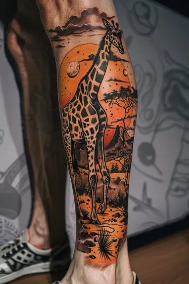 This bold Salvador Dali tattoo features a surreal giraffe standing tall in an orange-hued dreamscape that feels like the middle of a Dalà painting. The sunset bleeds into every part of the scene, casting deep shadows and glowing skies across the savanna. The landscape includes twisted trees, surreal mountains, and a glowing moon that somehow feels way too close to be real. The giraffe s legs are impossibly long, adding that signature Dalà touch, and if you look closely, you ll even spot subtle swirls and details in the ground that feel almost otherworldly.