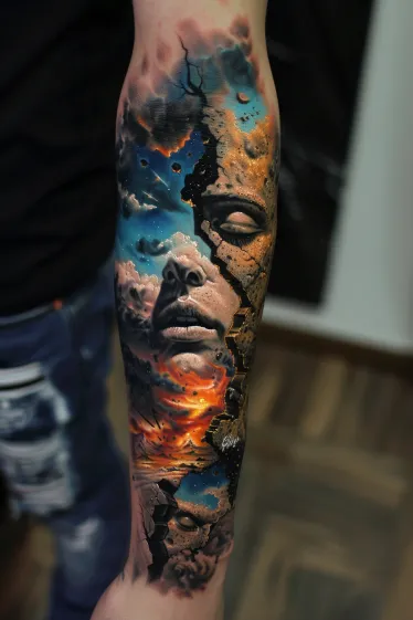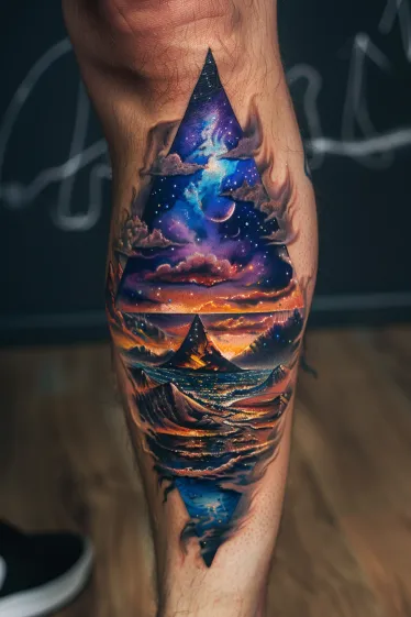 This Salvador Dali tattoo paints a cosmic dreamscape inside a sharp-edged triangle that seems to rip through the skin. Inside, there s a mix of swirling galaxies, crashing waves, and a glowing sunset sky, all layered over a distant mountain peak. The way the deep blues blend into fiery oranges feels almost otherworldly. It s like a portal into a Dali-inspired fantasy where nature and the cosmos melt together in perfect chaos.