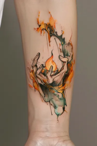 This stunning Salvador Dali tattoo features a pair of abstract hands gently cupping a flickering orange flame, surrounded by dreamy watercolor splashes and smokey green swirls. The sketch-style lines give the hands a raw, expressive energy, while the flame itself feels like it s dancing in a moment frozen in time. The bright orange tones blend effortlessly with muted greens and inky shadows, creating a perfect storm of surreal color chaos. It s bold, it s mysterious, and it tells a story you can t quite put into words.