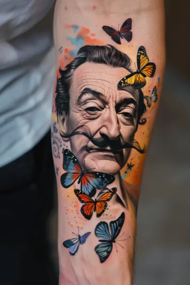 I love how this Salvador Dali tattoo captures both the genius and the fantasy of who he was. The butterflies make it feel alive and imaginative, like his thoughts are taking flight right off the skin. It s creative without being too over-the-top, and the forearm placement makes it totally show-off worthy. This piece has that perfect mix of elegance, artistry, and weirdness that makes Dalà such an icon. It honestly feels like something he would ve been flattered to see.