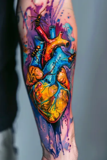 This bold and surreal Salvador Dali tattoo brings an anatomical heart to life with electric color and chaotic energy. The heart is bursting with vivid yellows, fiery oranges, and electric blues, all tangled together in sharp outlines and soft watercolor splashes. To take the weirdness up a notch, you ll spot a few ants crawling across the veins, which is such a Dalà move. Everything about this design feels alive and buzzing with surreal intensity, almost like it s beating with wild emotion right on the skin.