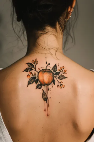 This delicate yet bizarrely beautiful Salvador Dali tattoo features a ripe peach surrounded by moody green leaves and surreal dripping red ink. The fruit looks realistic at first glance, but there s something slightly off in the most perfect Dalà way. The shading is soft and warm, and the placement between the shoulder blades makes it feel centered and elegant. The tiny berry-like buds and thin black stems add balance, but then you notice the drops falling from the bottom like something is melting or bleeding, and suddenly it feels like a dream gone weird.