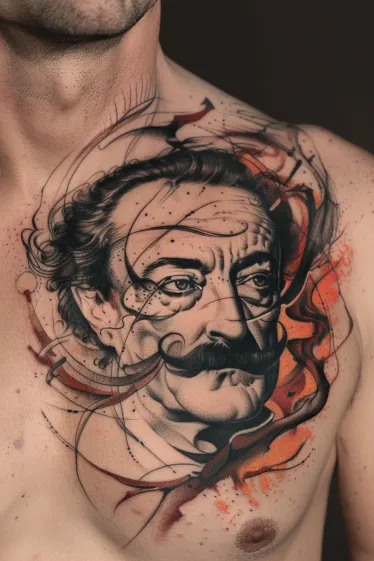 This stunning Salvador Dali tattoo shows a sharp black and grey portrait of the surrealist legend right across the chest, surrounded by a whirlwind of painterly brush strokes and sketch-style lines. His piercing stare, iconic mustache, and strong features are captured with striking realism, while the splashes of bold red and burnt orange add that untamed, imaginative flair Dalà was known for. The swirling black lines give it a sense of movement, almost like the portrait is coming alive right on the skin.