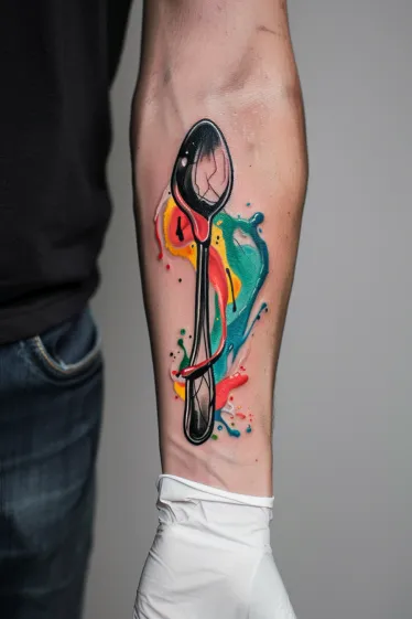 This playful Salvador Dali tattoo turns a simple spoon into a surreal little statement, with soft curves that almost make it look like it s beginning to melt. Behind it, bright splashes of watercolor in hot pink, teal, yellow, and orange explode like a cosmic mess of creativity. There s a small red string delicately wrapping around the handle, adding just enough mystery to make you wonder if there s some hidden meaning only the artist knows. The glossy shading on the spoon gives it this hyperrealistic shine that totally pops off the skin.
