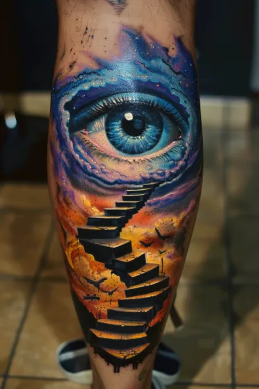 Salvador Dali Stairway and Eye Leg Tattoo