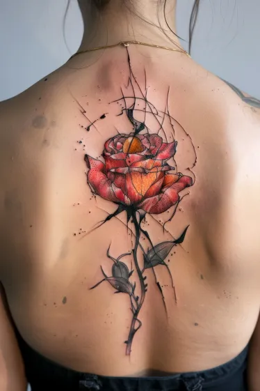 This stunning Salvador Dali tattoo features a fiery red-orange rose stretching along the spine, surrounded by chaotic black sketch lines and surreal ink splashes. The flower looks like it s blooming in slow motion, with petals that seem almost sculpted. The black elements feel cracked and fragmented, giving the impression that the rose is bursting through a dreamscape or shattering reality classic Dalà surrealism all the way. The stem winds down with delicate leaves, and the whole piece is bold yet delicate in a beautifully strange way.