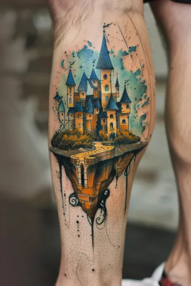 This dreamy calf tattoo shows a golden-yellow castle perched on a floating island, complete with spindly towers and whimsical blue rooftops. The structure feels almost storybook-perfect, but with a twist. The castle hovers midair, suspended above inky black drips and supported by a surreal, jagged foundation that makes it feel like it s pulled from a Dali daydream. Watercolor textures and abstract splashes of teal and rust orange in the background add even more fantasy to the piece.