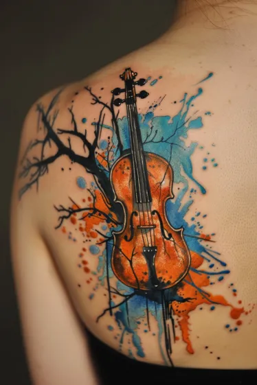 This gorgeous back tattoo features a deep orange violin centered against a chaotic splash of watercolor blues and fiery reds. The violin s body feels grounded and traditional, but it s wrapped in unexpected surrealist touches like black tree branches stretching from one side and painterly ink splatters dancing across the skin. The whole thing feels alive with motion, like the music itself is bursting from the strings and bleeding into the world around it.