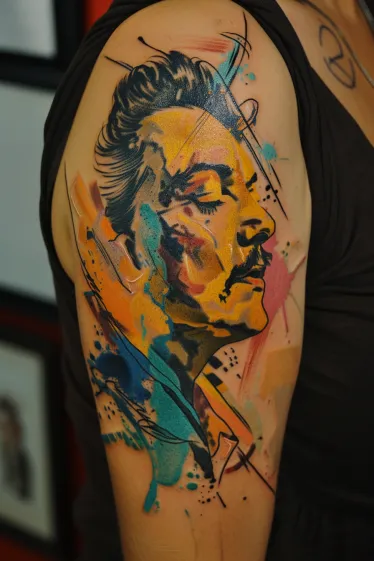 This bold arm piece captures Salvador Dali s iconic face with his eyes gently closed, as if lost in a surrealist dream. But instead of going for a classic look, the whole design bursts into wild watercolor chaos. Splashes of yellow, blue, and coral swirl together with inky outlines and sketchy lines that make it feel alive and spontaneous. It s like a painting that just jumped off the canvas and decided to live on skin instead.