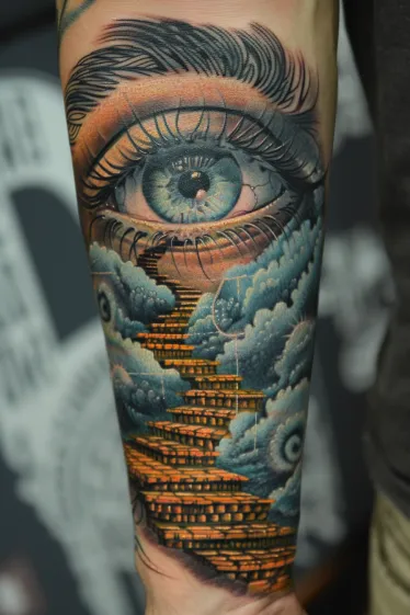 This mesmerizing Salvador Dali tattoo takes surrealism to new heights with a glowing eye perched above a winding golden staircase that rises through a sea of dreamlike clouds. The eye is intensely detailed, with hypnotic shades of blue that pull your gaze in like a portal. The staircase is warm and glowing, almost like it s lit from within, and the clouds are shaded with swirls that add just enough texture to feel soft and otherworldly. As you look closer, tiny hidden eyes peek out from the clouds, watching like secret keepers of some dreamy mystery.