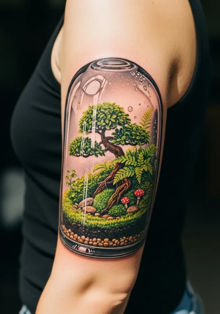 This upper arm tattoo features a lush terrarium scene inside a glass dome. The colors are rich greens with tiny pops of red from miniature mushrooms. A bonsai style tree fills the center and the glass effect is crystal clear with soft reflections. The piece is large enough to show every leaf and pebble in realistic detail.