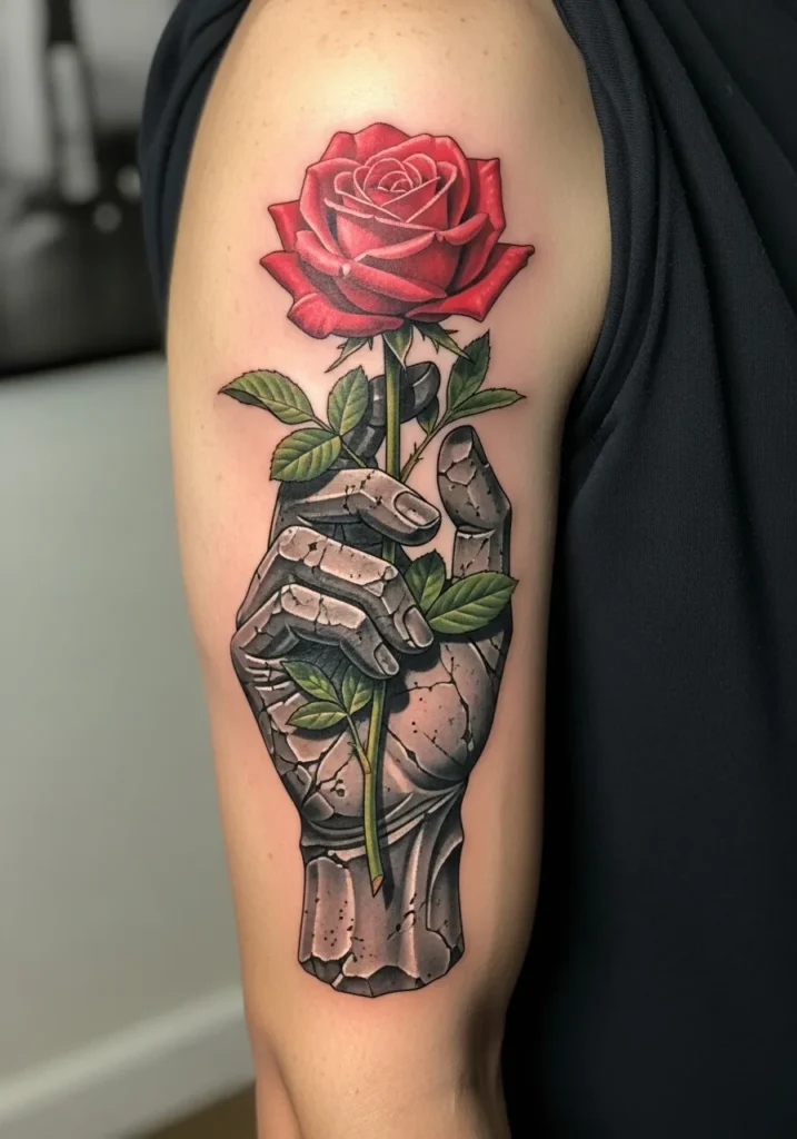 This upper arm tattoo features a cracked stone hand clutching a bright red rose. The realism is strong with tiny fractures running through the hand and soft shading that makes the bloom look velvety. The green leaves add a fresh contrast which makes the red pop even more. The size gives the details room to shine.