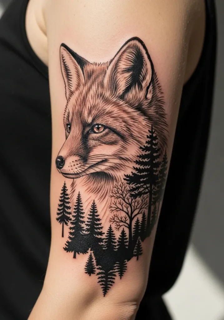 This upper arm tattoo blends a realistic fox face with a silhouette of tall pine trees beneath it. The fur is detailed with soft lines and warm tones while the trees sit in bold black shapes. The composition is balanced which makes it feel grounded and natural.