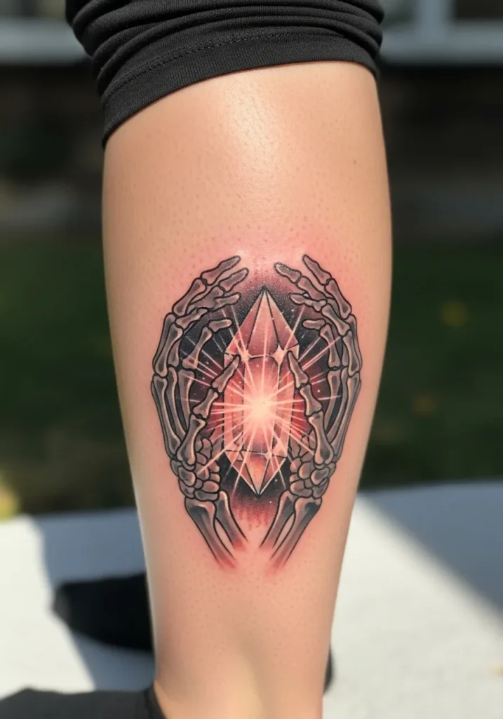 This calf tattoo features two skeletal hands forming a frame around a glowing crystal. The bones are shaded in cool grey tones while the crystal bursts with warm pink and orange light. The light rays give the whole design a magical shine. The placement makes the shape sit cleanly along the calf muscle.