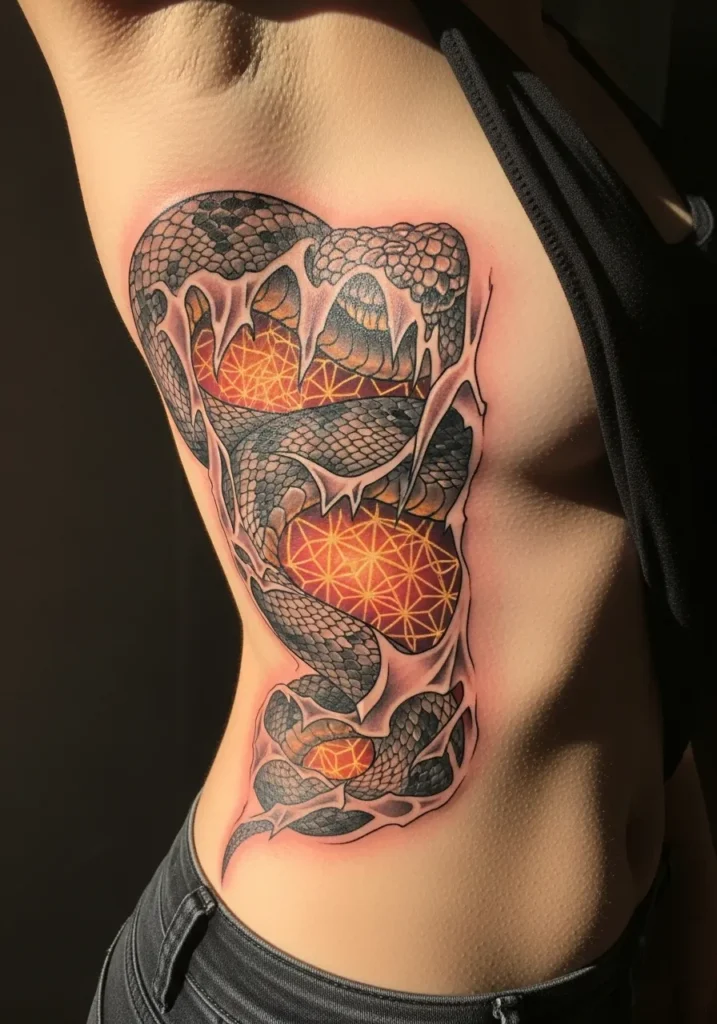 This ribcage tattoo wraps a patterned serpent around glowing orange geometric shapes that look like they burn beneath the skin. The scales are shaded with deep blacks and greys while sharp highlights make the snake feel alive. The warm inner glow creates a powerful contrast against the cooler tones around it.