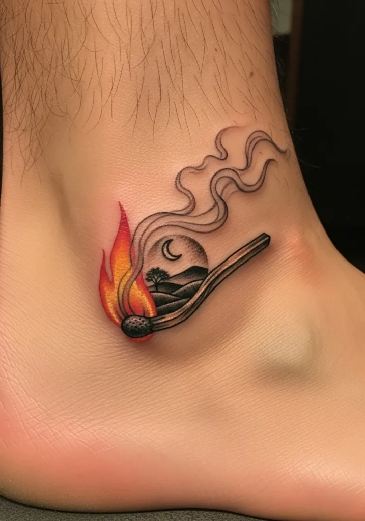 This ankle tattoo shows a lit match where the flame transforms into a tiny landscape. You can see rolling hills silhouetted under a crescent moon with soft grey smoke drifting upward. The flame glows with warm reds and yellows which makes the whole scene feel cozy.