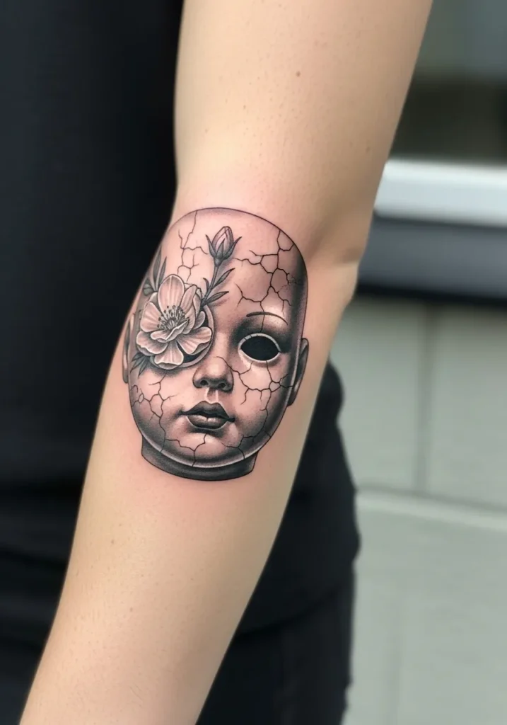Cracked Doll Head With Flower Tattoo