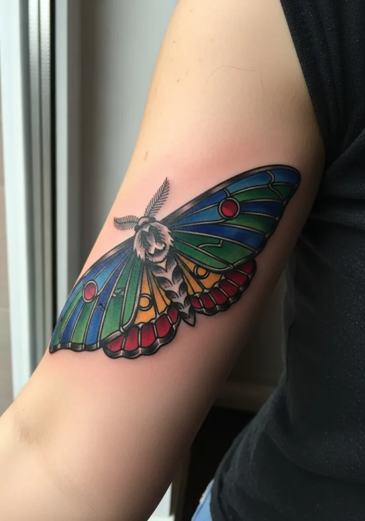 This upper arm tattoo shows a brightly colored moth with wings designed to look like stained glass. The blue green yellow and red panels shine with smooth gradients that mimic real glass. The black outlines give the piece a bold structured feel. The size fills the arm nicely without overpowering it.