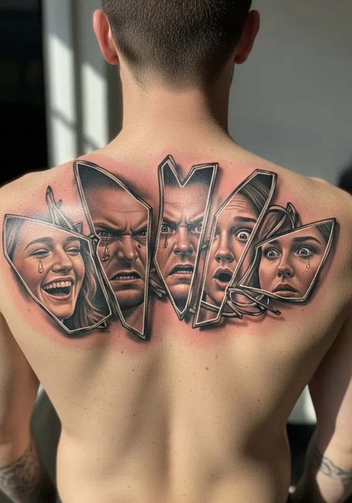 This large upper back tattoo shows five realistic faces captured inside broken mirror shards. Each fragment holds a different expression from joy to fear to anger which makes the whole piece feel dramatic and alive. The shading is smooth and precise with soft reds around the edges that mimic fresh irritation. The size spreads wide across the shoulders which gives every face enough space to stand out.