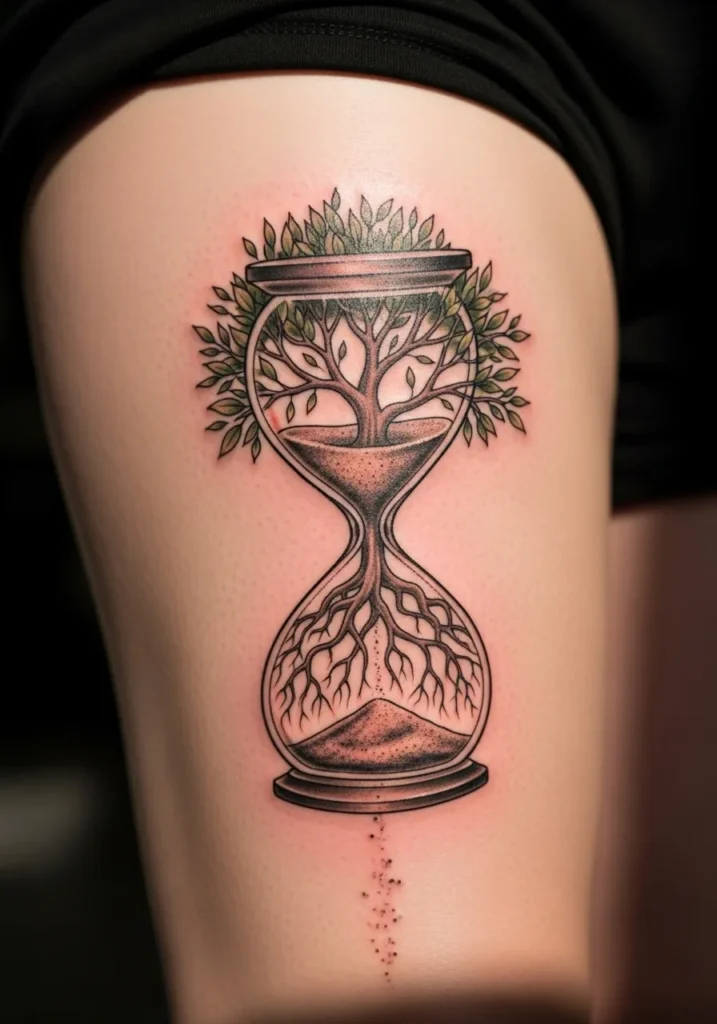 This thigh tattoo features an hourglass where the top holds a full tree and the bottom holds its roots. The sand pours between the two sections in a subtle dotted style. The greens sit softly inside the black and grey shading which gives the whole piece a calm look.