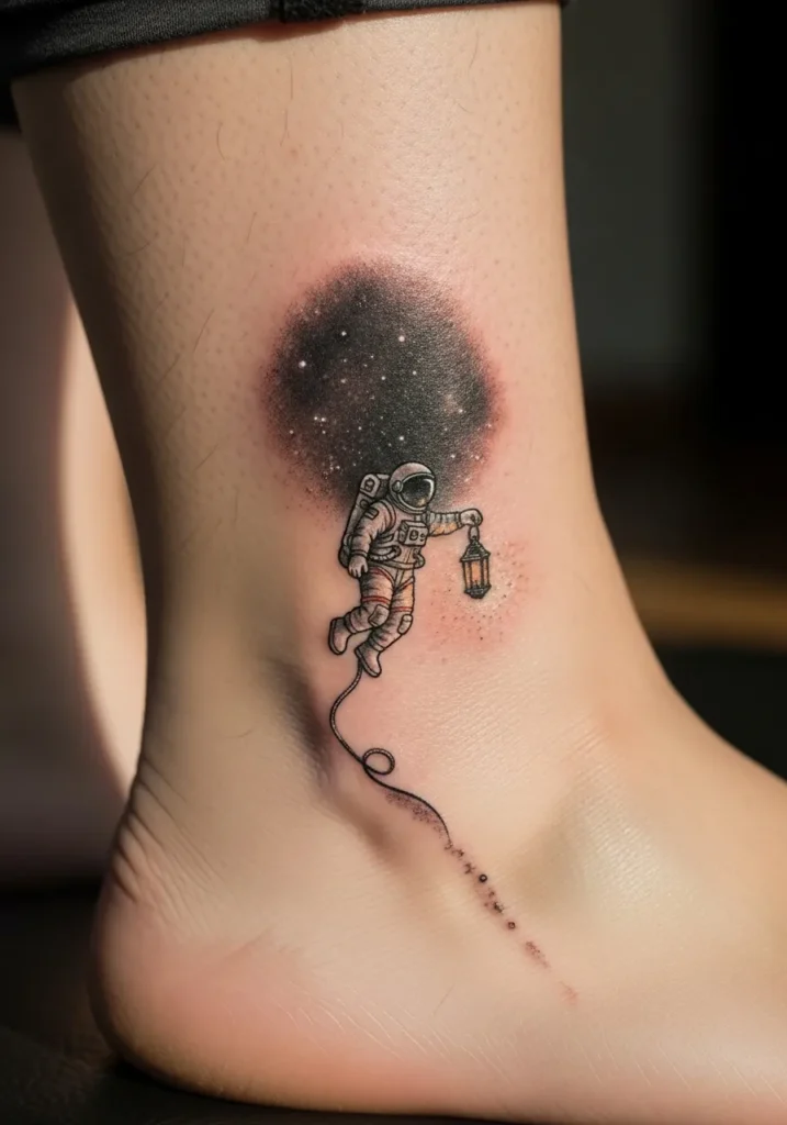 This ankle tattoo shows a tiny astronaut floating near a soft cloud of stars. The lantern he holds gives the scene a gentle glow. The realism is subtle with fine lines for the suit and a dreamy fade around the star cluster. The small size makes it delicate and charming.