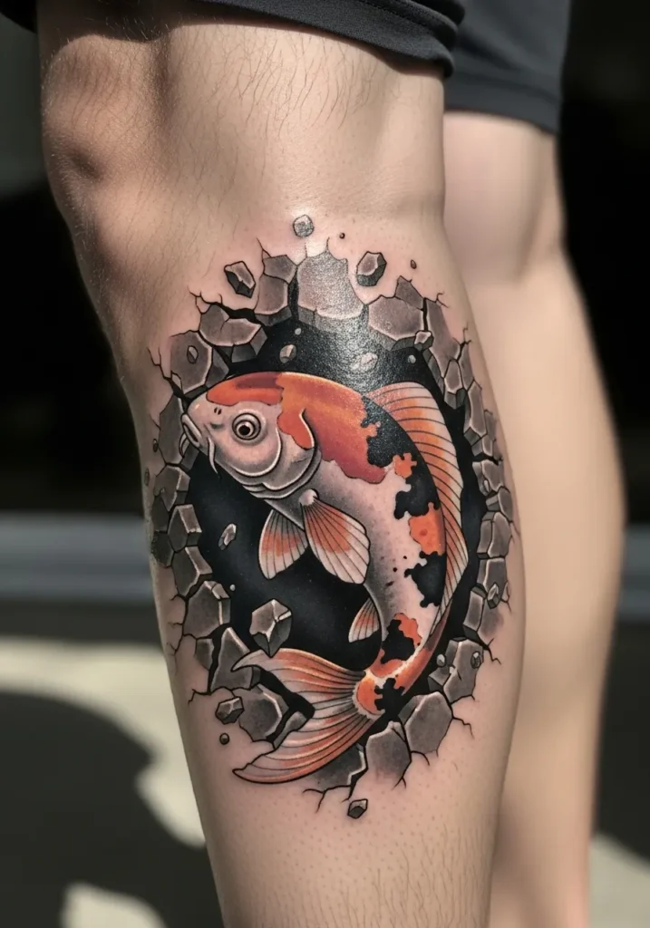 This thigh tattoo shows a bold koi fish pushing through cracked stone. The realism is strong with warm orange tones blending into soft black patches. The shattered stone frame adds depth and makes the koi look like it is bursting forward. The size is generous which gives the scales and fins room to stand out.